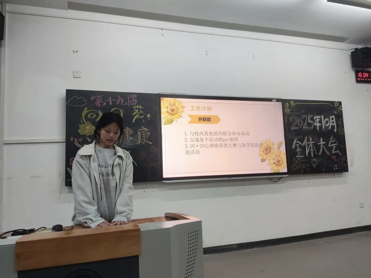 10月29日下午2时,向日葵心理健康团队第十九届第一次全体大会在教1-209顺利召开。会议围绕欢迎新成员、解读工作制度及凝聚团队共识展开,旨在增进成员对团队的归属感与责任感。大学生心理健康教育中心主任杨玖炼老师与指导老师彭思怡应邀参加,会长黄琪主持本次会议。