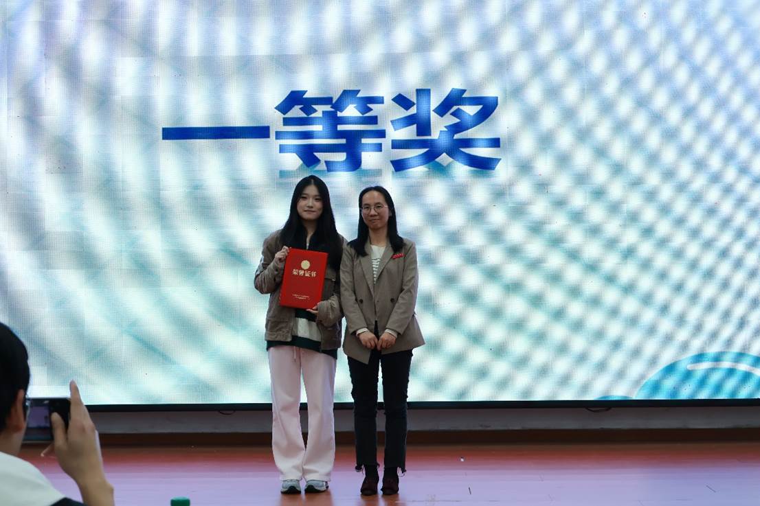 点评结束后,评委老师对参赛队伍进行颁奖,其中数媒2506班的《走出虚拟风暴》荣获一等奖,由设计工程学院党总支副书记唐林丽老师颁奖。