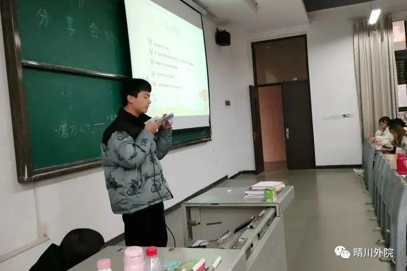 紧接着赵小岩同学展示了书中的经典语录,并结合亲身经历谈谈自己的感受。“有些人刻骨铭心,没几年就遗忘;有些人不论生死,一直陪在身旁”。正如书中的刘十三与外婆王莺莺相依为命一样,赵小岩同学从小和奶奶一起生活。小时的奶奶是那样的高大健朗,但当奶奶躺在病床上时,赵小岩同学才深深感到岁月蹉跎,自己已经长大,而陪伴自己长大的人已然变老。“树欲静而风不止,子欲养而亲不待”,赵小岩同学强调我们要珍惜眼前人,特别是一直在我们身边,默默陪伴我们长大的人,不要等到失去才追悔莫及。