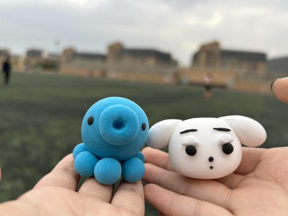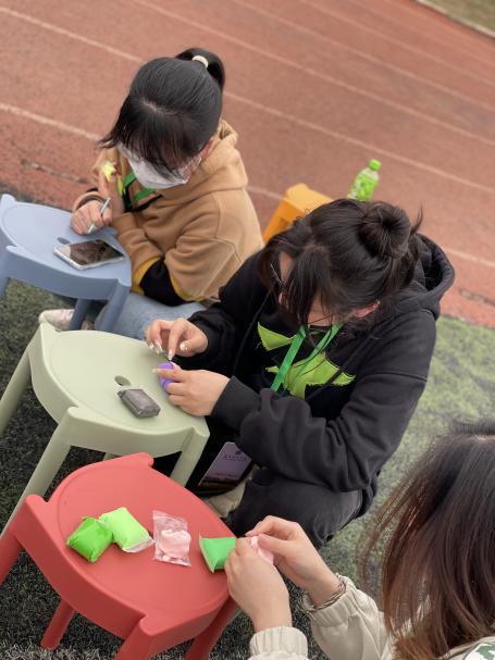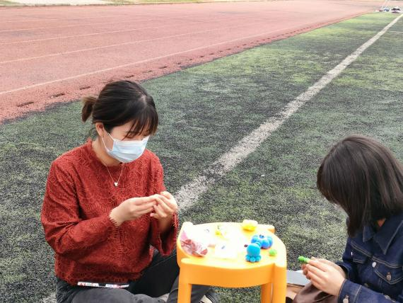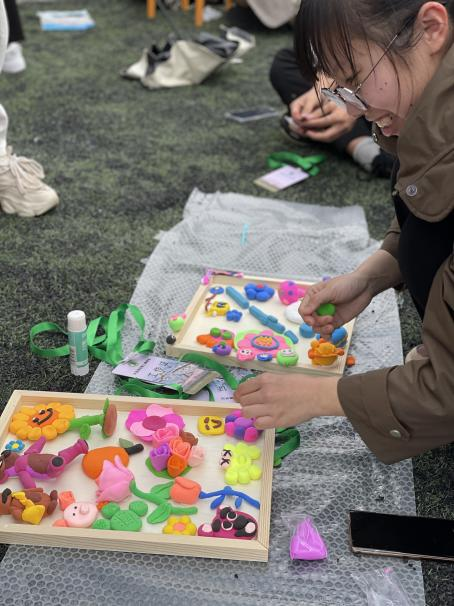 在主持人对活动流程做了简单介绍后,活动正式开始。由DIY粘土环节为活动拉开序幕,五颜六色的粘土在同学们的手里变得活灵活现,有的同学按照图片捏了小猫,有得捏了花朵,有的同学甚至自己创造了可爱的角色。同学们蹲坐在足球场草坪上,沐浴着温暖、柔和的阳光,在音乐声里愉快的交谈,创作出了一幅专属“驿”家人们的彩色记忆。
