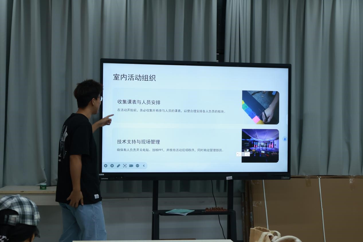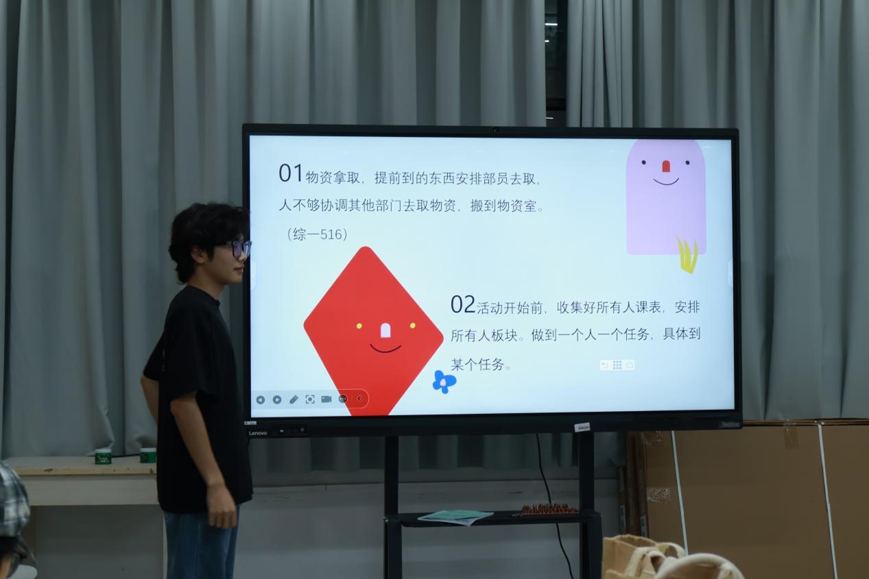 活动部在物资保障方面需提前规划,安排部员及时拿取所需物资,若出现人员不足的情况,积极协调其他部门支援,将物资妥善搬运至物资室;活动开始前,部门全面收集所有成员课表,科学安排工作板块,实现 “一人一任务”,确保责任落实到个人;同时,提前组织无课成员参与物资清点与搬运工作,并安排全体人员提前到场布置活动现场,为活动开展做好充分准备;在活动进行中,负责现场秩序维护、人员引导等设备保障工作,精准把控活动流程,保障活动顺利推进。