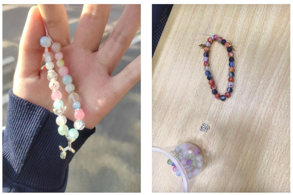 同学们领取材料包后,充分发挥创意,将代表朋友陪伴的粉色珠子、象征学业进步的蓝色配件、寓意心情明媚的黄色串珠等‘小确幸’元素融入设计。彩珠与配件在指尖的穿梭中被巧妙串联,化作独一无二的手链。